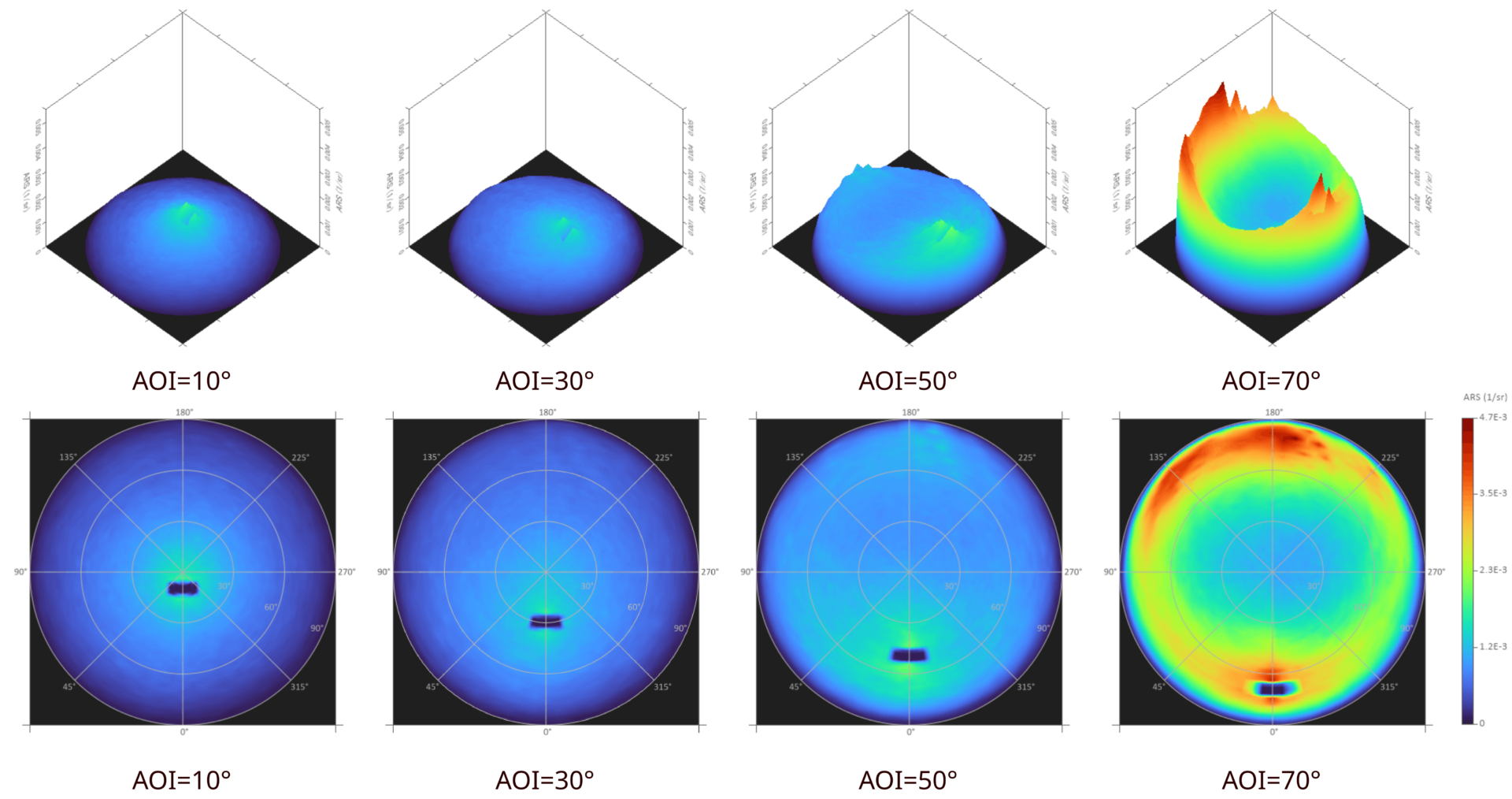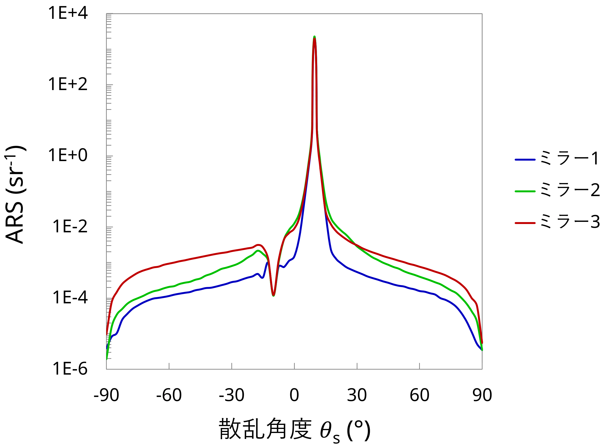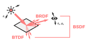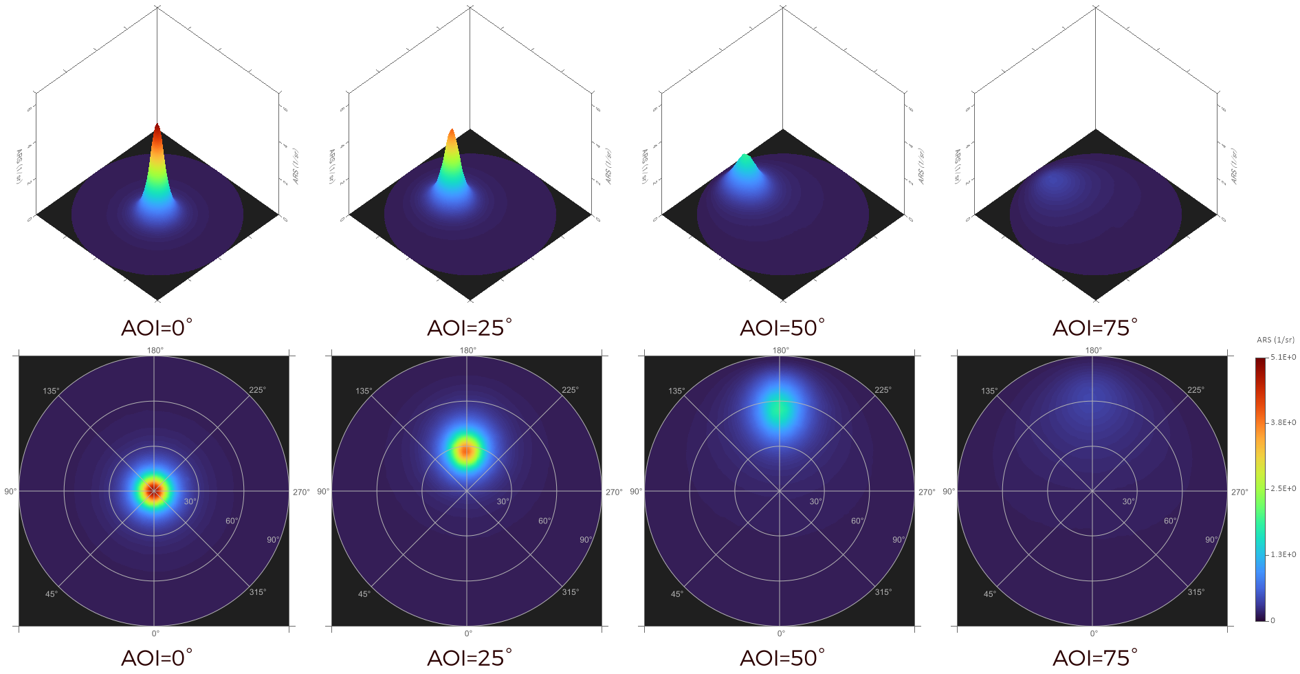 標準白色板で校正を行なうことにより、サンプルのBSDF (双⽅向散乱分布関数、Bidirectional Scattering Distribution Function) と反射率を測定できます。