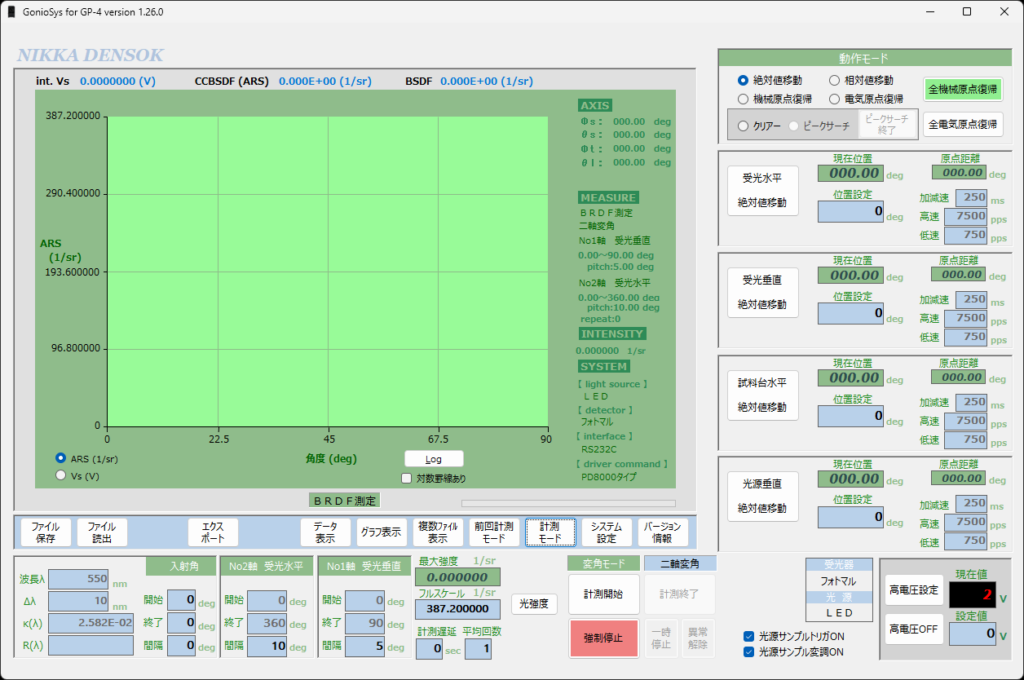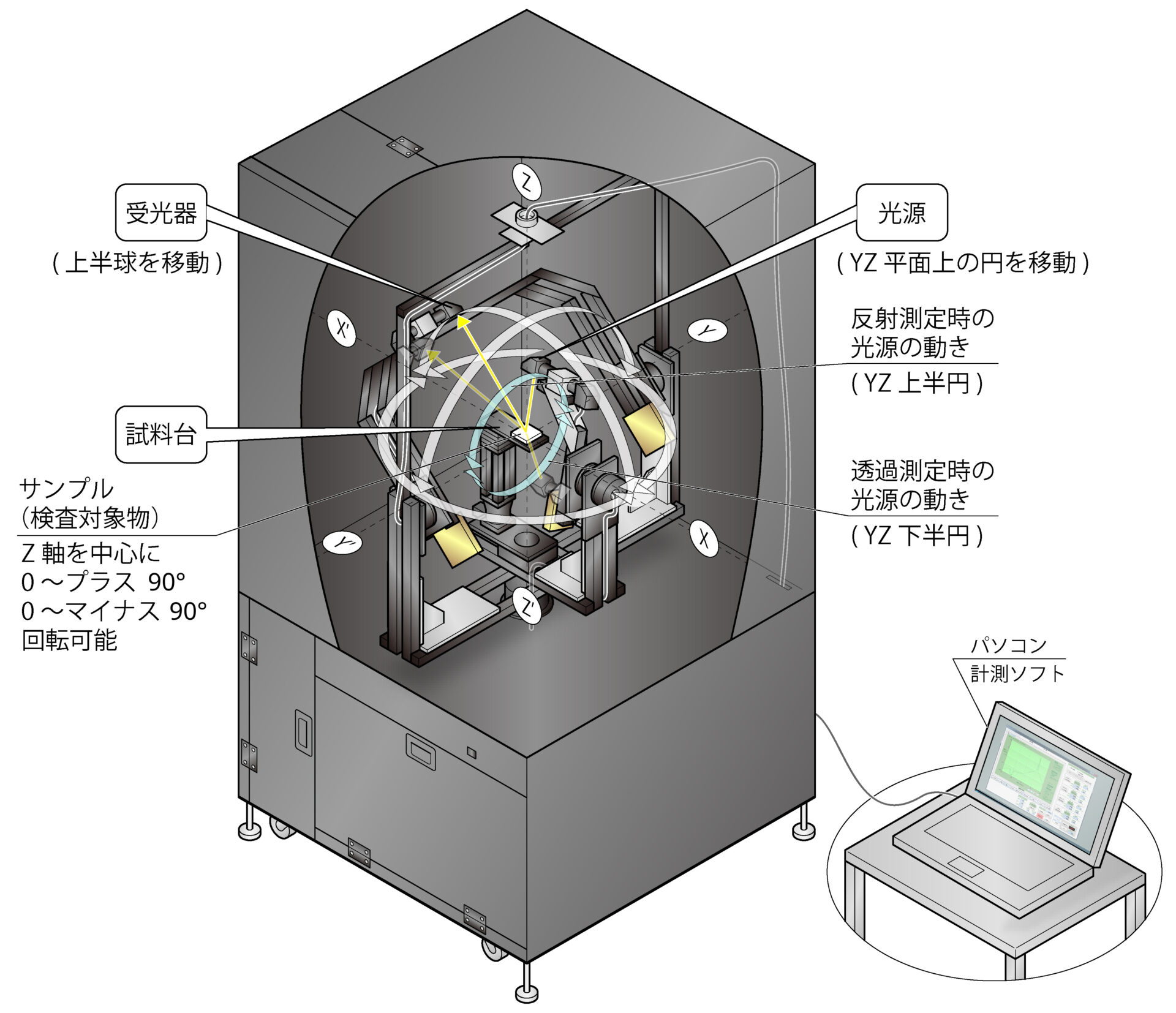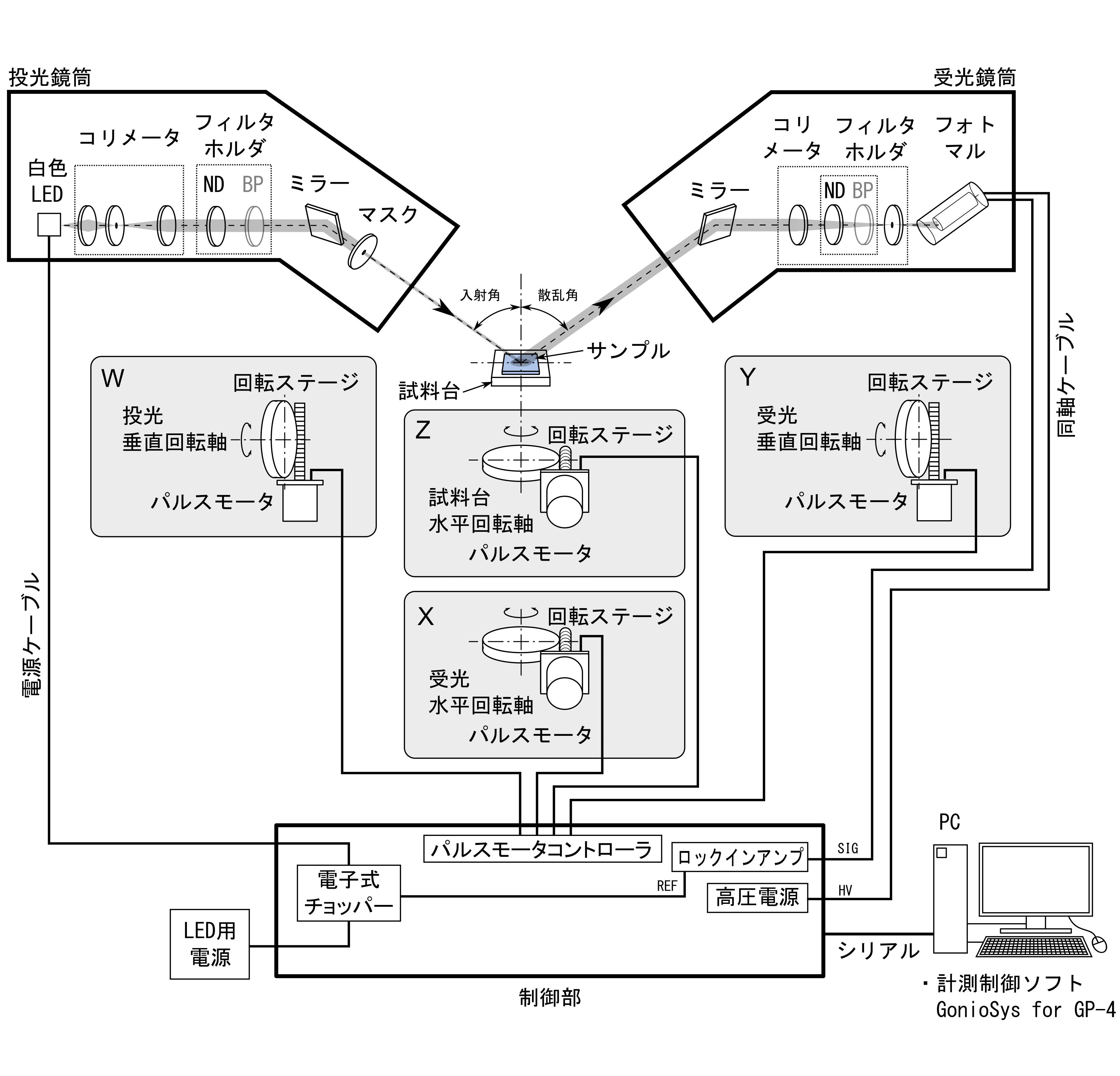 | 自動制御軸数 | 4軸 受光器水平回転:± 180° 受光器垂直回転:± 100° 投光器垂直回転:± 180° 試料台水平回転:± 90° |