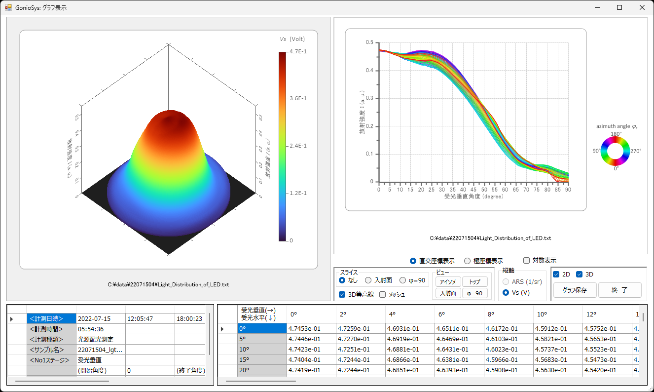 発光体の配光測定も半球を3次元測定します。